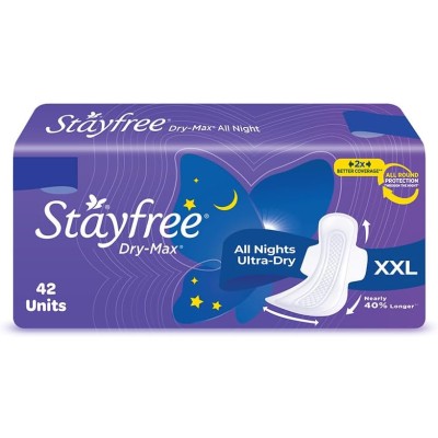 Stayfree Dry Max All Night XL Dry Cover Sanitary Pads For Women With Wings, 42 pieces