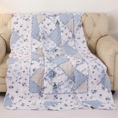 VIVILINEN Patchwork Quilt Throw Blanket for Couch Sofa Twin Size Blue Vintage Floral Reversible Lightweight Quilted Bedspread
